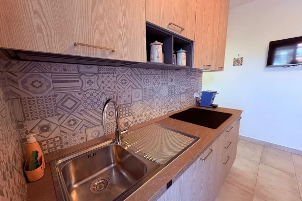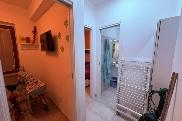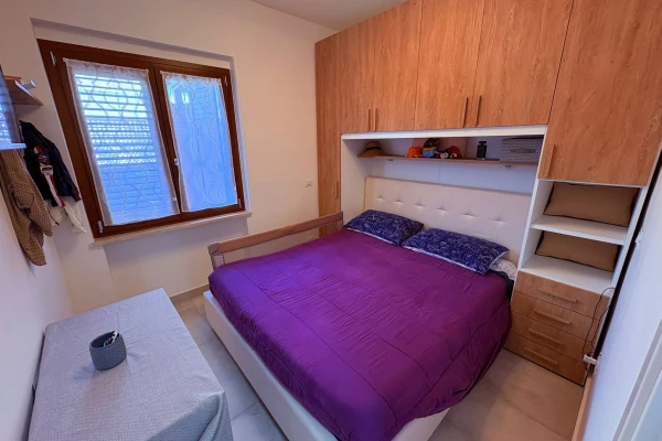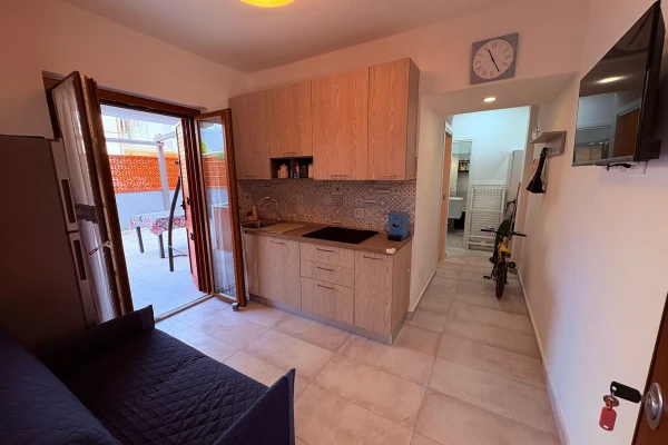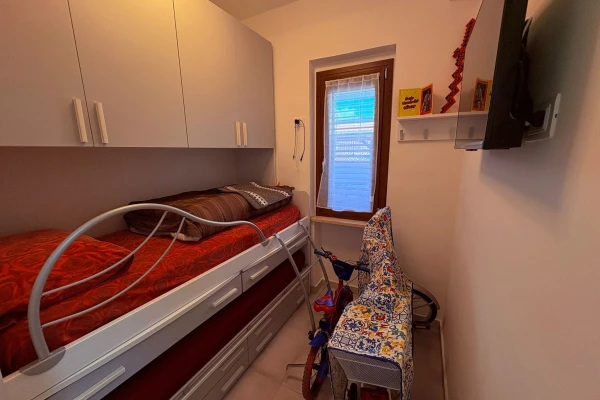 The entrance opens onto a welcoming living room, where the induction hob, modern and essential, tells of an everyday life made of simplicity and style. Each room has been renovated with attention, in a perfect balance between functionality and domestic warmth. Two bedrooms – a double and a delightful bedroom with bunk beds – offer intimate and private spaces, ideal for both families and those who wish to host guests. The bathroom, with a shower cubicle, is a small jewel of cleanliness and rationality.